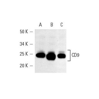 mouse monoclonal IgG1; CD9 Antibody (C-4) is an IgG1 κ mouse monoclonal CD9 antibody (also designated p24 antibody, MRP-1 antibody, Tetraspanin-29 antibody or Leukocyte antigen MIC3 antibody) that detects the CD9 protein of mouse, rat and human origin by WB, IP, IF, IHC(P), FCM and ELISA. CD9 Antibody (C-4) is available as both the non-conjugated anti-CD9 antibody form, as well as multiple conjugated forms of anti-CD9 antibody, including agarose, HRP, PE, FITC and multiple Alexa Fluor® conjugates. CD9 is a type IV transmembrane glycoprotein with four transmembrane domains. CD9 on pre-B cells may play a role in cell-cell adhesion. In addition, CD9 may play a role in signal transduction mediated by interaction with low molecular weight GTP-binding proteins. CD9 is expressed on early B cells, eosinophils, basophils and activated T cells and is a major component of the platelet cell surface. It is also expressed on most non-T acute lymphoblastic leukemia cells and on some acute myeloid and chronic lymphoid leukemias.