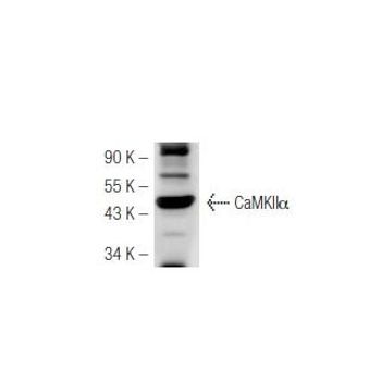 mouse monoclonal IgG2a; CaMKIIα Antibody (A-1) is an IgG2a κ mouse monoclonal CaMKII alpha antibody (also designated CAMK2A antibody or calcium/calmodulin dependent protein kinase II alpha antibody) that detects the CaMKII alpha protein of mouse, rat and human origin by WB, IP, IF, IHC(P) and ELISA. CaMKIIα Antibody (A-1) is available as both the non-conjugated anti-CaMKII alpha antibody form, as well as multiple conjugated forms of anti-CaMKII alpha antibody, including agarose, HRP, PE, FITC and multiple Alexa Fluor® conjugates. The Ca2+/calmodulin-dependent protein kinases (CaM kinases) comprise a structurally related subfamily of serine/threonine kinases which include CaMKI, CaMKII and CaMKIV. CaMKII is a ubiquitously expressed serine/threonine protein kinase that is activated by Ca2+and calmodulin (CaM) and has been implicated in regulation of the cell cycle and transcription. There are four CaMKII isozymes designated α, β, γ and δ, which may or may not be co-expressed in the same tissue type. CaMKIV is stimulated by Ca2+ and CaM but also requires phosphorylation by a CaMK for full activation. Stimulation of the T cell receptor CD3 signaling complex with an anti-CD3 monoclonal antibody leads to a 10-40 fold increase in CaMKIV activity. An additional kinase, CaMKK, functions to activate CaMKI through the specific phosphorylation of the regulatory Threonine residue at position 177.