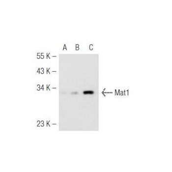 mouse monoclonal IgG1; Mat1 Antibody (F-6) is an IgG1 κ mouse monoclonal Mat1 antibody (also designated Mat1 antibody) that detects the Mat1 protein of mouse, rat and human origin by WB, IP, IF, IHC(P) and ELISA. Mat1 Antibody (F-6) is available as both the non-conjugated anti-Mat1 antibody form, as well as multiple conjugated forms of anti-Mat1 antibody, including agarose, HRP, PE, FITC and multiple Alexa Fluor® conjugates. Progression through the cell cycle requires activation of a series of enzymes designated cyclin dependent kinases (Cdks). The monomeric catalytic subunit, Cdk2, a critical enzyme for initiation of cell cycle progression, is completely inactive. Partial activation is achieved by the binding of regulatory cyclins such as cyclin D1, while full activation requires phosphorylation at Thr 160. The enzyme responsible for phosphorylation of Thr 160 in Cdk2 and also Thr 161 in Cdc2 p34, designated Cdk-activating kinase (CAK), has been partially purified and shown to be comprised of a catalytic subunit, a regulatory subunit and a subunit of unknown function. The regulatory subunit is a novel cyclin (cyclin H) and is required for activation of Cdk7. This previously undescribed protein, now termed Mat1, has been cloned as a protein that associates with the cyclin H-Cdk7 nuclear complex at all stages of the cell cycle. Cyclin H-Cdk7-Mat1 complexes display kinase activity towards Cdk activation domains, and the carboxy terminus of RNA polymerase II. Mat1 appears to constitute the first example of an assembly factor, essential for the formation of an active Cdk-cyclin complex.
