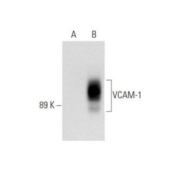 mouse monoclonal IgG1; VCAM-1 Antibody (E-10) is an IgG1 κ mouse monoclonal VCAM-1 antibody (also designated vascular cell adhesion molecule 1 antibody or CD106 antibody) that detects the VCAM-1 protein of mouse, rat and human origin by WB, IP, IF, IHC(P), FCM and ELISA. VCAM-1 Antibody (E-10) is available as both the non-conjugated anti-VCAM-1 antibody form, as well as multiple conjugated forms of anti-VCAM-1 antibody, including agarose, HRP, PE, FITC and multiple Alexa Fluor® conjugates. Cell adhesion molecules are a family of closely related cell surface glycoproteins involved in cell-cell interactions during growth and are thought to play an important role in embryogenesis and development. Neuronal cell adhesion molecule (NCAM) expression is observed in a variety of human tumors including neuroblastomas, rhabdomyosarcomas, Wilms' tumors, Ewing's sarcomas and some primitive myeloid malignancies. The intracellular adhesion molecule-1 (ICAM-1), also referred to as CD54, is an integral membrane protein of the immunoglobulin superfamily and recognizes the B2α1 and B2αM integrins. PECAM-1 (platelet/endothelial cell adhesion molecule-1), also referred to as CD31, is a glycoprotein expressed on the cell surfaces of monocytes, neutrophils, platelets and a subpopulation of T cells. VCAM-1 (vascular cell adhesion molecule-1) was first identified as an adhesion molecule induced on human endothelial cells by inflammatory cytokines such as IL-1, tumor necrosis factor (TNF) and lipopolysaccharide (LPS). The KALIG gene encodes a nerve cell adhesion molecule (NCAM) -like protein and is deleted in 66% of patients with Kallmann's syndrome, anosmia with secondary hypogonadism.