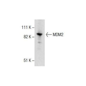 mouse monoclonal IgG2b; MDM2 Antibody (D-7) is an IgG2b κ mouse monoclonal MDM2 antibody that detects MDM2 of mouse, rat and human origin by WB, IP, IF, IHC(P) and ELISA. MDM2 Antibody (D-7) is available as the non-conjugated anti-MDM2 antibody form, as well as multiple conjugated forms of anti-MDM2 antibody, including agarose, HRP, PE, FITC and multiple Alexa Fluor® conjugates. p53 is the most commonly mutated gene in human cancer identified to date. Expression of p53 leads to inhibition of cell growth by preventing progression of cells from G1 to S phase of the cell cycle. Most importantly, p53 functions to cause arrest of cells in the G1 phase of the cell cycle following any exposure of cells to DNA-damaging agents. The MDM2 (murine double minute-2) protein was initially identified as an oncogene in a murine transformation system. MDM2 functions to bind p53 and block p53-mediated transactivation of cotransfected reporter constructs. The MDM2 gene is amplified in a high percentage of human sarcomas that retain wildtype p53 and tumor cells that overexpress MDM2 can tolerate high levels of p53 expression. These findings argue that MDM2 overexpression represents at least one mechanism by which p53 function can be abrogated during tumorigenesis.