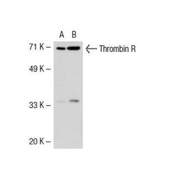 mouse monoclonal IgG1; Thrombin R Antibody (ATAP2) is an IgG1 κ mouse monoclonal Thrombin R antibody (also designated thrombin receptor antibody, F2R antibody, coagulation factor II antibody, or PAR1 antibody) that detects the Thrombin R protein of mouse, rat and human origin by WB, IP, IF, IHC(P) and FCM. Thrombin R Antibody (ATAP2) is available as both the non-conjugated anti-Thrombin R antibody form, as well as multiple conjugated forms of anti-Thrombin R antibody, including agarose, HRP, PE, FITC and multiple Alexa Fluor® conjugates. Thrombin is a serine protease that is involved in platelet aggregation and blood coagulation. It is cleaved from its precursor, prothrombin, and converts fibrinogen to Fibrin in the final step of the clotting cascade. Thrombin mediates its regulatory effects by activating cell surface receptors. These receptors, including Thrombin R (also designated PAR-1, for protease-activated receptor-1), PAR-2 and PAR-3, are members of the G protein-coupled receptor family, and share a similar gene structure. Thrombin cleaves its receptor, releasing a 41 amino acid peptide that acts as a platelet agonist. Upon this activation by thrombin, the Thrombin Rs trigger an increase in cytosolic Ca(2+) concentration. Unactivated Thrombin R cycles between the cell surface and an intracellular pool, while activated Thrombin R internalizes rapidly and is degraded in the lysosomes. The human Thrombin R is also known to be regulated by Sp1 and Sp3 transcription factors.
