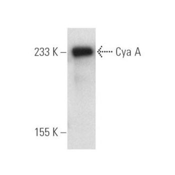 mouse monoclonal IgG2a; Cya A Antibody (9D4) is an IgG2a κ mouse monoclonal Cya A antibody that detects Cya A of B. pertussis origin by WB. Cya A Antibody (9D4) is available as the non-conjugated anti-Cya A antibody form, as well as multiple conjugated forms of anti-Cya A antibody, including agarose, HRP, PE, FITC and multiple Alexa Fluor® conjugates. Bordetella pertussis, the causative agent of whooping cough, secretes several toxins implicated in this disease. One of these putative virulence factors is the adenylate cyclase toxin (Cya A or ACT), which elevates intracellular cAMP in eukaryotic cells to cytotoxic levels upon activation by endogenous calmodulin. The Bordetella pertussis Cya toxin-encoding locus (Cya) is composed of five genes. The Cya A gene encodes a virulence factor, Cya A, exhibiting adenylate cyclase, hemolytic and invasive activities. Cya A is related to the RTX (repeats in toxin) family of pore-forming toxins. Like all RTX toxins, Cya A is synthesized as a protoxin (proCya A) encoded by the cyaA gene. Activation to the mature cell-invasive toxin involves palmitoylation of Lysine 983 and is dependent on co-expression of Cya C. The Cya B, D and E gene products are necessary for Cya A transport, and the Cya C gene product is required to activate Cya A. Additionally, Cya A uses the αMβ2 Integrin (CD11b/CD18) as a cell receptor. Thus, the cellular distribution of CD11b, mostly on neutrophils, macrophages, and dendritic and natural killer cells, supports a role for Cya A in disrupting the early, innate antibacterial immune response.