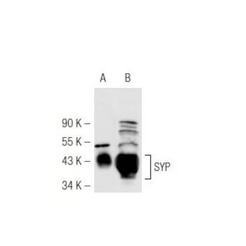 mouse monoclonal IgG1; SYP Antibody (D-4) is an IgG1 κ mouse monoclonal SYP antibody (also designated SYP antibody, SYPH antibody, Major Synaptic Vesicle Protein P38 antibody, MRX96 antibody, or MRXSYP antibody) that detects the SYP protein of mouse, rat and human origin by WB, IP, IF, IHC(P) and ELISA. SYP Antibody (D-4) is available as both the non-conjugated anti-SYP antibody form, as well as multiple conjugated forms of anti-SYP antibody, including agarose, HRP, PE, FITC and multiple Alexa Fluor® conjugates. Synaptic vesicles participate in a cycle of fusion with the plasma membrane and reformation by endocytosis. Synaptic vesicle protein synaptophysin (SYP) is targeted to early endosomes in transfected fibroblasts and in neuroendocrine cells. SYP is an N-glycosylated intergral membrane protein found in neurons and endocrine cells that associates into hexamers to form a large conductance channel. SYP contains four transmembrane domains and may function as a gap juction-like channel. Membrane cholesterol specfically interacts with SYP to play a role in vesicle formation. Synaptobrevin (VAMP) also binds to SYP and the resultant complex is upregulated during neuronal development, but is absent in exocytosis fusion complex. Thus, the synaptophysin-synaptobrevin complex is not essential for exocytosis, but rather provides a pool of synaptobrevin for exocytosis. In addition, the tail domain of brain Myosin V also forms a stable complex with synaptobrevin II and SYP, and this complex is disassembled upon the depolarization-induced entry of Ca2+ into intact nerve endings.