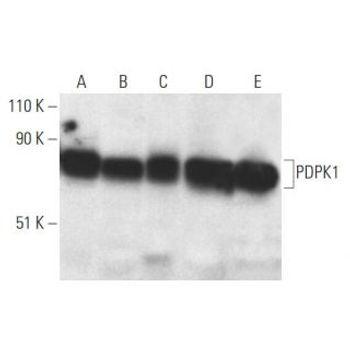 mouse monoclonal IgG1; PDPK1 (3-phosphoinositide dependent protein kinase 1), also known as PDK1, PDPK2, PDPK2P or PRO0461, is 556 amino acid ubiquitously expressed protein that localizes to the cell membrane, cytoplasm and nucleus. Acting as a master kinase, PDPK1 phosphorylates and activates a subgroup of the AGC family of protein kinases. PDPK1 is involved in mediating signal transduction for controlling proliferation, survival, and growth of developing pancreatic beta cells, regulating Ca2+ uptake and Ca2+-activated K+ channels of mast cells, regulation of chemotaxis and motility of vascular endothelial cells, cardiac homeostasis, and thymocyte development. Belonging to the protein kinase superfamily, PDPK1 contains a PH domain, which play an essential role in homodimerization, localization and nuclear import of PDPK1, and a protein kinase domain. PDPK1 exists as five alternatively spliced isoforms and is encoded by a gene located on human chromosome 16p13.3.