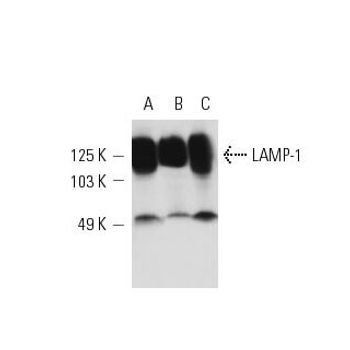 mouse monoclonal IgG2a; LAMP-1 Antibody (E-5) is an IgG2a κ mouse monoclonal LAMP-1 antibody (also designated LAMP-1 antibody or LAMP1 antibody) that detects LAMP-1 of mouse, rat and human origin by WB, IP, IF and IHC(P). LAMP-1 Antibody (E-5) is available as the non-conjugated anti-LAMP-1 antibody form, as well as multiple conjugated forms of anti-LAMP-1 antibody, including agarose, HRP, PE, FITC and multiple Alexa Fluor® conjugates. Lysosome-associated membrane proteins (LAMP) are glycosylated type I membrane proteins that play a role in the biogenesis of the pigment melanin. LAMP-1 (also designated CD107a) and LAMP-2 (also designated CD107b) are involved in a variety of functions, including cellular adhesion, and are thought to participate in the process of tumor invasion and metastasis. Newly synthesized LAMP-1 and LAMP-2 proteins are sorted at the trans-Golgi network and are transported intracellularly via a pathway that is distinct from the Clathrin-coated vesicles used for the mannose-6 phosphate receptor. LAMP-1 is expressed on the surface of Thrombin-activated but not resting platelets, and it is thought to be involved in the adhesive, prothrombic properties of these cells. Both LAMP-1 and LAMP-2 are involved in maintaining lysosome acidity and protecting the lysosomal membranes from autodigestion, and their expression is increased in patients with lysosomal storage disorders.
