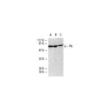 mouse monoclonal IgG2a; Plk Antibody (F-8) is an IgG2a κ mouse monoclonal Plk antibody (also designated PLK1 antibody, PLK-1 antibody, STPK13 antibody or Polo-like kinase 1 antibody) that detects the Plk protein of mouse, rat and human origin by WB, IP, IF and ELISA. Plk Antibody (F-8) is available as both the non-conjugated anti-Plk antibody form, as well as multiple conjugated forms of anti-Plk antibody, including agarose, HRP, PE, FITC and multiple Alexa Fluor® conjugates. Plk (for polo-like kinase) encodes a serine/threonine kinase that is closely related to polo and CDC5, genes that are required for passage through mitosis in Drosophila and Saccharomyces, respectively. Polo and CDC5 both code for proteins that are involved in regulating the function of the mitotic spindle. Plk protein accumulates in the cell during the S and G2 phases of the cell cycle and both protein content and catalytic activity peak at the onset of mitosis, followed by a rapid reduction after mitosis. Plk expression is detectable in mitotically active tissues such as colon and placenta, as well as in tumors of various origins. It has also been suggested that Plk may serve as a marker of cell proliferation.