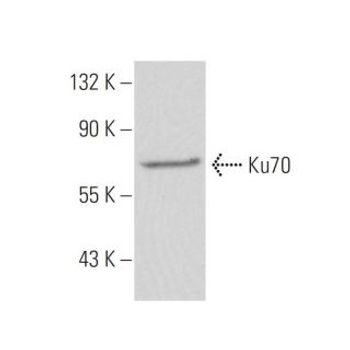 mouse monoclonal IgG1; Ku70 Antibody (E-5) is an IgG1 κ mouse monoclonal Ku70 antibody (also designated XRCC6 antibody, or X-ray repair cross complementing 6 antibody) that detects the Ku70 protein of mouse, rat and human origin by WB, IP, IF, IHC(P) and ELISA. Ku70 Antibody (E-5) is available as both the non-conjugated anti-Ku70 antibody form, as well as multiple conjugated forms of anti-Ku70 antibody, including agarose, HRP, PE, FITC and multiple Alexa Fluor® conjugates. The Ku protein is localized in the nucleus and is composed of subunits referred to as Ku70 (p70) and Ku86 (p86) which is also known by the synonym Ku80 or (p80). Ku was first described as an autoantigen to which antibodies were produced in a patient with scleroderma polymyositis overlap syndrome, and was later found in the sera of patients with other rheumatic diseases. Both subunits of the Ku protein have been cloned, and a number of functions have been proposed for Ku, including cell signaling, DNA replication and transcriptional activation. Ku is involved in Pol II-directed transcription by virtue of its DNA binding activity, serving as the regulatory component of the DNA-associated protein kinase that phosphorylates Pol II and transcription factor Sp. Ku proteins also activate transcription from the U1 small nuclear RNA and the human transferrin receptor gene promoters. A Ku-related protein designated the enhancer 1 binding factor (E1BF), composed of two subunits, has been identified as a positive regulator of RNA polymerase I transcription initiation.