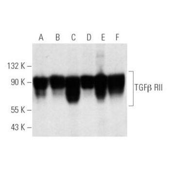 mouse monoclonal IgG1; TGFβ RII Antibody (C-4) is an IgG1 κ mouse monoclonal TGF beta RII antibody (also designated TGFBR2 antibody, or transforming growth factor beta receptor 2 antibody) that detects the TGF beta RII protein of mouse, rat and human origin by WB, IP, IF, IHC(P) and ELISA. TGFβ RII Antibody (C-4) is available as both the non-conjugated anti-TGF beta RII antibody form, as well as multiple conjugated forms of anti-TGF beta RII antibody, including agarose, HRP, PE, FITC and multiple Alexa Fluor® conjugates. A total of three members of the TGFβ family, TGFβ1, TGFβ2 and TGFβ3, have been identified in mammals. Each is synthesized as a latent precursor that is subsequently cleaved forming the 112 amino acid growth factor which becomes active upon dimerization. TGFβs mediate their activity by high affinity binding to the type II receptor (TGFβ RII) transmembrane protein with a cytoplasmic serine-threonine kinase domain. TGFβ RII (TGF-beta receptor type-2), also known as TGFBR2, is a 567 amino acid single-pass type I membrane protein that contains one protein kinase domain and is a member of the protein kinase superfamily, TKL Ser/Thr protein kinase family and TGFB receptor subfamily. For signaling growth inhibition and early gene responses, TGFβ RII requires both its kinase activity and association with a TGFβ-binding protein, designated the type I receptor. TGFβ RII exists as two alternatively spliced isoforms that are encoded by a gene that maps to human chromosome 3.