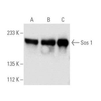 mouse monoclonal IgG2b; Sos 1 Antibody (A-9) is an IgG2b κ mouse monoclonal Sos 1 antibody (also designated SOS Ras/Rac Guanine Nucleotide Exchange Factor 1 antibody, Gingival Fibromatosis Hereditary 1 antibody, Son Of Sevenless Homolog 1 antibody, SOS-1 antibody, GF1 antibody, HGF antibody, Son Of Sevenless Homolog 1 (Drosophila) antibody, Guanine Nucleotide Exchange Factor antibody, GINGF antibody, or GGF1 antibody) that detects the Sos 1 protein of mouse, rat and human origin by WB, IP, IF and ELISA. Sos 1 Antibody (A-9) is available as both the non-conjugated anti-Sos 1 antibody form, as well as multiple conjugated forms of anti-Sos 1 antibody, including agarose, HRP, PE, FITC and multiple Alexa Fluor® conjugates. The superfamily of GTP-binding proteins, of which Ras proteins are prototypes, has been implicated in a broad range of biological activities. Studies have identified a family of guanine nucleotide-releasing factors (GRFs) that activate Ras in mammalian cells and an "adapter" protein (Sem 5/GRB2) that appears to mediate the interaction of GRFs with activated receptor molecules. Ras-GRF p140 promotes nucleotide exchange on ras p21s but not on other members of the Ras gene superfamily. In addition, three mammalian homologs of the Drosophila Ras-GRF, son of sevenless (Sos), have been described. These include two from mouse, m Sos 1 and m Sos 2, and one from human, h Sos. Vav p95 has been reported to function as a GRF in activation of Ras by the T cell receptor and has been reported to have a domain similar to that of Dbl p115, which is a GRF specific for CDC42Hs. Subsequent to activation, Ras appears to interact with Raf, thereby activating the MAP kinase phosphorylation pathway.