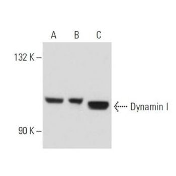mouse monoclonal IgG2a; Dynamin Antibody (E-11) is an IgG2a κ mouse monoclonal Dynamin antibody (also designated Dynamin antibody) that detects the Dynamin protein of mouse, rat and human origin by WB, IP, IF and ELISA. Dynamin Antibody (E-11) is available as both the non-conjugated anti-Dynamin antibody form, as well as multiple conjugated forms of anti-Dynamin antibody, including agarose, HRP, PE, FITC and multiple Alexa Fluor® conjugates. Members of the dynamin family, including Dynamin I and Dynamin II, are GTPase, microtubule-associated proteins which are involved in endocytosis, synaptic transmission and neurogenesis. Dynamin I is localized to the central nervous system, while Dynamin II exhibits ubiquitous distribution with highest expression found in testis. Both dynamin proteins contain SH3 and proline-rich domains that mediate interactions between the dynamins and effectors of their GTPase activity. The interactions with these effectors, which include microtubules, acidic phospholipids and SH3 domain-containing proteins, are required for rapid endocytosis. Dynamin I appears to be recruited to clathrin coated pits by SH3 domain interaction with amphiphysin, a protein highly expressed in brain.