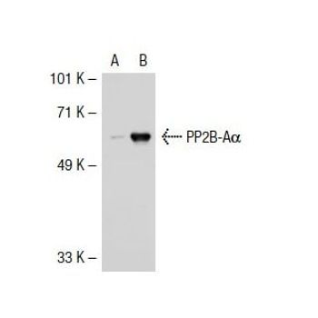 mouse monoclonal IgG2b; PP2B-Aα Antibody (D-9) is an IgG2b κ mouse monoclonal PP2B-A alpha antibody (also designated PP2BA antibody, Protein Phosphatase 3 Catalytic Subunit Alpha antibody, Serine/Threonine-Protein Phosphatase 2B Catalytic Subunit Alpha Isoform antibody, Calmodulin-Dependent Calcineurin A Subunit Alpha Isoform antibody, CAM-PRP Catalytic Subunit antibody, Calcineurin A Alpha antibody, CALNA antibody, PPP2B antibody, CNA1 antibody, Protein Phosphatase 3 Catalytic Subunit Alpha Isozyme antibody, or CALNA1 antibody) that detects the PP2B-A alpha protein of mouse, rat and human origin by WB, IP, IF and ELISA. PP2B-Aα Antibody (D-9) is available as both the non-conjugated anti-PP2B-A alpha antibody form, as well as multiple conjugated forms of anti-PP2B-A alpha antibody, including agarose, HRP, PE, FITC and multiple Alexa Fluor® conjugates. In eukaryotes, the phosphorylation and dephosphorylation of proteins on serine and threonine residues is an essential means of regulating a broad range of cellular functions including division, homeostasis and apoptosis. A group of proteins that are intimately involved in this process are the protein phosphatases. In general, the protein phosphatase (PP) holoenzyme is a trimeric complex composed of a regulatory subunit, a variable subunit and a catalytic subunit. Four major families of protein phosphatase catalytic subunit have been identified, designated PP1, PP2A, PP2B and PP2C. An additional protein phosphatase catalytic subunit, PPX (also known as PP4), is a putative member of a novel PP family. The PP2B family comprises subfamily members PP2B-Aα, PP2B-Aβ and PP2B-Aγ. Two additional regulatory subunits been identified, designated PP2B-B1 and PP2B-B2.
