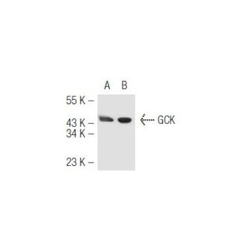 mouse monoclonal IgG1; GCK Antibody (G-6) is an IgG1 κ mouse monoclonal GCK antibody (also designated HK4 antibody, hexokinase 4 antibody, HKIV antibody, MODY2 antibody, maturity onset diabetes of the young 2 antibody, or glucokinase (hexokinase 4) antibody) that detects the GCK protein of mouse, rat and human origin by WB, IP, IF and ELISA. GCK Antibody (G-6) is available as both the non-conjugated anti-GCK antibody form, as well as multiple conjugated forms of anti-GCK antibody, including agarose, HRP, PE, FITC and multiple Alexa Fluor® conjugates. Glucokinase (also designated hexokinase IV, HXKIV or GCK) plays a key role in the regulation of glucose-induced insulin secretion. GCK is expressed in pancreatic beta cells where it functions as the major glucose sensor of the body, determining the "set point" for insulin secretion. GCK is also expressed in the liver, where it catalyzes the first committed step in the disposal of glucose. Phosphorylation of glucose by glucokinase appears to be the rate-limiting step for glucose catabolism. A lack of glucokinase activity leads to reduced insulin secretion and hyperglycemia, and has been implicated as a cause for maturity onset diabetes of the youth (MODY). In fact, heterozygous point mutations in the gene encoding GCK have been detected in individuals suffering from MODY.