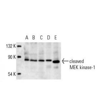 mouse monoclonal IgG2a; MEK kinase-1 Antibody (F-11) is an IgG2a κ mouse monoclonal MEK kinase-1 antibody that detects MEK kinase-1 of mouse, rat and human origin by WB, IP, IF, IHC(P) and ELISA. MEK kinase-1 Antibody (F-11) is available as the non-conjugated anti-MEK kinase-1 antibody form, as well as multiple conjugated forms of anti-MEK kinase-1 antibody, including agarose, HRP, PE, FITC and multiple Alexa Fluor® conjugates. Mitogen-activated protein (MAP) kinase cascades are activated by various extracellular stimuli including growth factors. The MEK kinases (also designated MAP kinase kinase kinases, MKKKs, MAP3Ks or MEKKs) phosphorylate and thereby activate the MEKs (also called MAP kinase kinases or MKKs), including ERK, JNK and p38. These activated MEKs in turn phosphorylate and activate the MAP kinases. The MEK kinases include Raf-1, Raf-B, Mos, MEK kinase-1, MEK kinase-2, MEK kinase-3, MEK kinase-4, ASK 1 (MEK kinase-5) and MAP3K6 (MEK kinase-6). MEK kinase-1 activates the ERK and c-Jun NH(2)-terminal kinase (JNK) pathways by phosphorylation of MAP2K1 and MAP2K4, and also activates the central protein kinases of the NFκB pathway, CHUK and IKBKB. Additionally, MEK kinase-1 uses an E3 ligase through its PHD domain, a RING-finger-like structure, to target proteins for degradation through ubiquitination.
