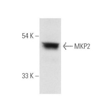 mouse monoclonal IgG2a; MKP-2 Antibody (F-10) is an IgG2a κ mouse monoclonal MKP-2 antibody (also designated MKP2 antibody or DUSP4 antibody) that detects the MKP-2 protein of mouse, rat and human origin by WB, IP, IF and ELISA. MKP-2 Antibody (F-10) is available as both the non-conjugated anti-MKP-2 antibody form, as well as multiple conjugated forms of anti-MKP-2 antibody, including agarose, HRP, PE, FITC and multiple Alexa Fluor® conjugates. MKP-2 (MAP kinase phosphatase 2, Dual specificity protein phosphatase 4 (DUSP4)) is a phoshpatase involved in the complex MAPKKK cascade. MKP-2 belongs to the protein-tyrosine phosphatase family (Non-receptor class dual specificity subfamily) and contains one rhodanese domain and one tyrosine-protein phosphatase domain. A dual specificity protein phosphatase, MKP-2 has a stringent substrate specificity for MAPKs. It acts to regulate mitogenic signal transduction by dephosphorylating both Thr and Tyr residues on MAP kinases ERK 1 and ERK 2. Transcription factor E2F-1, which is responsible for mediating apoptosis and suppressing tumorigenesis, acts as a transcriptional regulator of MKP-2. E2F-1 is physically associated with the MKP-2 promoter and can transactivate the promoter of the MKP-2 gene. Specifically, E2F-1 binds to a perfect palindromic motif in the MKP-2 promoter. MKP-2 is an essential cell death mediator in the E2F-1 pathway and may lead to the development of new strategies for cancer treatment.