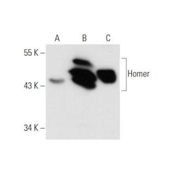 mouse monoclonal IgG1; Homer Antibody (D-3) is an IgG1 κ mouse monoclonal Homer antibody (also designated HOMER1 antibody, or SYN47 antibody) that detects the Homer protein of mouse, rat and human origin by WB, IP, IF, IHC(P) and ELISA. Homer Antibody (D-3) is available as both the non-conjugated anti-Homer antibody form, as well as multiple conjugated forms of anti-Homer antibody, including agarose, HRP, PE, FITC and multiple Alexa Fluor® conjugates. Homer family proteins, also designated Vesl (for VASP/Ena-related gene upregulated during seizure) and LTP, are immediate early gene products that bind to group 1 metabotropic glutamate receptors (mGluRs), proteins involved in triggering intracellular calcium release. Unlike Homer-1a, the prototype member of the Homer family, other Homer family members (Homer-1b and -1c, Homer-2a, -2b and -2c and Homer-3) are constitutively expressed and contain a coiled-coil (CC) domain that mediates self-multimerization. Homer-1a is enriched at excitatory synapses, does not multimerize and appears to block the association of mGluRs to CC-Homer proteins. Homer proteins have also been shown to link mGluRs with the inositol triphosphate receptors (IP3R).