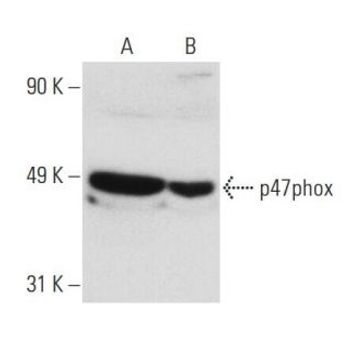 mouse monoclonal IgG1; p47phox Antibody (A-7) is an IgG1 κ mouse monoclonal p47phox antibody that detects p47phox of mouse, rat and human origin by WB, IP, IF, IHC(P) and ELISA. p47phox Antibody (A-7) is available as the non-conjugated anti-p47phox antibody form, as well as multiple conjugated forms of anti-p47phox antibody, including agarose, HRP, PE, FITC and multiple Alexa Fluor® conjugates. The heredity chronic granulomatous disease (CGF) has been linked to mutations in p47phox and p67-phox. The cytosolic proteins p47phox and p67-phox, also designated neutrophil cytosol factor (NCF)1 and NCF2, respectively, are required for activation of the superoxide-producing NADPH oxidase in neutrophils and other phagocytic cells. During activation of the NADPH oxidase, p47phox and p67-phox migrate to the plasma membrane where they associate with cytochrome b558 and the small G protein Rac to form the functional enzyme complex. Both p47phox and p67-phox contain two Src homology 3 (SH3) domains. The C-terminal SH3 domain of p67-phox has been shown to interact with the proline-rich domain of p47phox, suggesting that p47phox may faciliate the transport of p67-phox to the membrane.