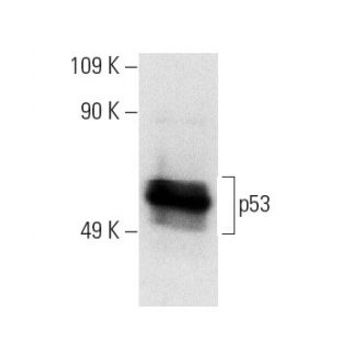 mouse monoclonal IgG1; p53 Antibody (D-11) is an IgG1 κ mouse monoclonal p53 antibody (also designated p53 antibody or TP53 antibody) that detects p53 of mouse, rat and human origin by WB, IP, IF and ELISA. p53 Antibody (D-11) is available as the non-conjugated anti-p53 antibody form, as well as multiple conjugated forms of anti-p53 antibody, including agarose, HRP, PE, FITC and multiple Alexa Fluor® conjugates. p53, a DNA-binding, oligomerization domain- and transcription activation domain-containing tumor suppressor, upregulates growth arrest and apoptosis-related genes in response to stress signals, thereby influencing programmed cell death, cell differentiation, and cell cycle control mechanisms. p53 localizes to the nucleus, yet can be chaperoned to the cytoplasm by the negative regulator, MDM2. MDM2 is an E3 ubiquitin ligase that is upregulated in the presence of active p53, where it poly-ubiquitinates p53 for proteasome targeting. p53 fluctuates between latent and active DNA-binding conformations and is differentially activated through posttranslational modifications, including phosphorylation and acetylation. Mutations in the DNA-binding domain (DBD) of p53, amino acids 110-286, can compromise energetically-favorable association with cis elements and are implicated in several human cancers.