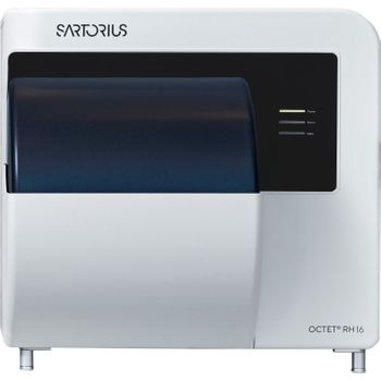 The system provides analytical performance similar to the 8- channel Octet® R8 system, but with higher levels of throughput, speed, and flexibility. The high detection sensitivity and impressive throughput of Octet® RH16 system has made it a favorite for small molecule library screening and analysis of large cross-competition binding matrices. Kinetic analysis including association and dissociation of biomolecules can be performed on up to 384 samples in one 384-well microplate. Fully automated workflows can be realized due to integrated robotic solutions, extending the unattended run time of the system. Target ligands can be batch immobilized onto biosensors and returned to the biosensor tray for re-use in future experiments, thus extending the number of uses for each biosensor, preserving valuable ligand, and maximizing flexibility in experimental design.  Key benefits: Sensitivity - Detection of low molecular weight molecules (≥ 150 Da) High throughput - 16-well simultaneous sampling in 384-well and 96-well formats Flexibility - Two plate locations maximize throughput and improve workflow Unattended operation - Automation friendliness allows multiple-plate assays in one run  User-friendliness - Advanced software offers greater versatility in experimental design and data analysis