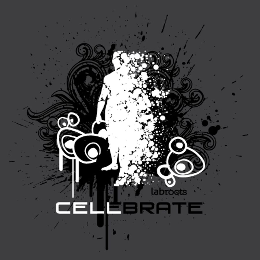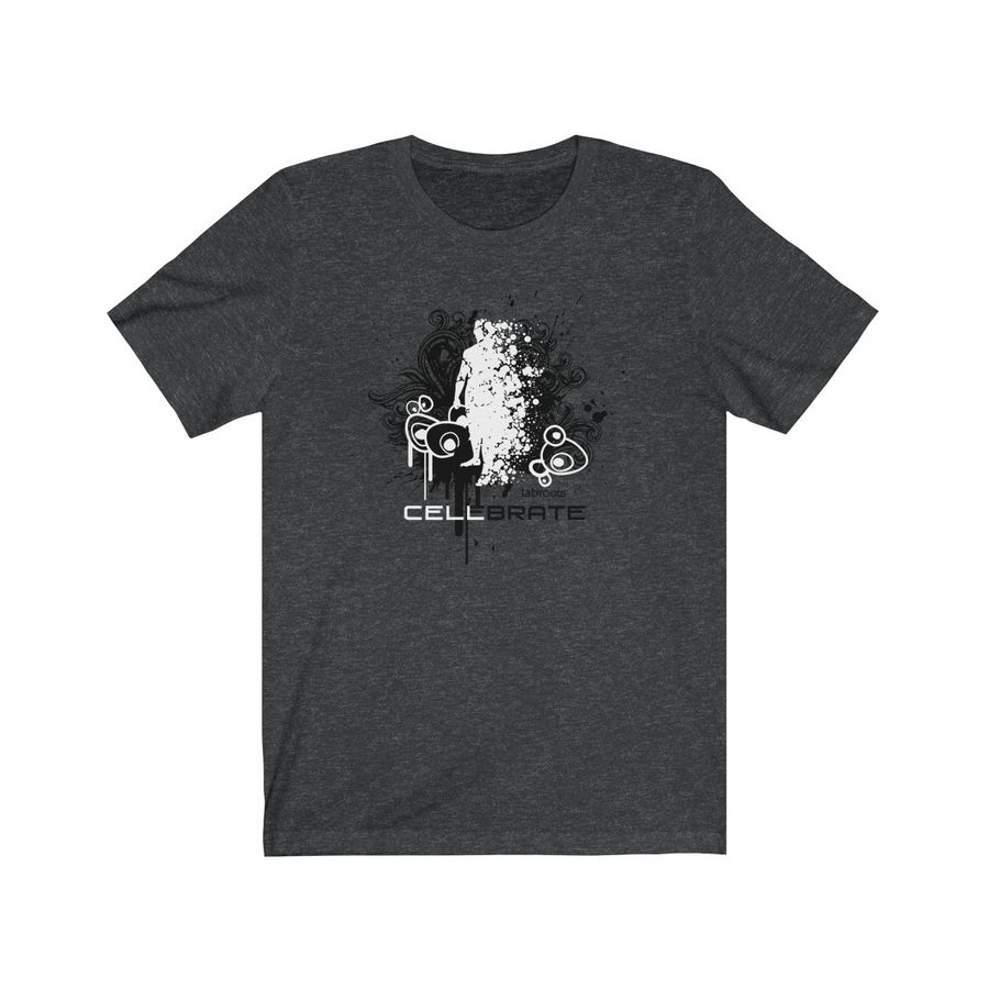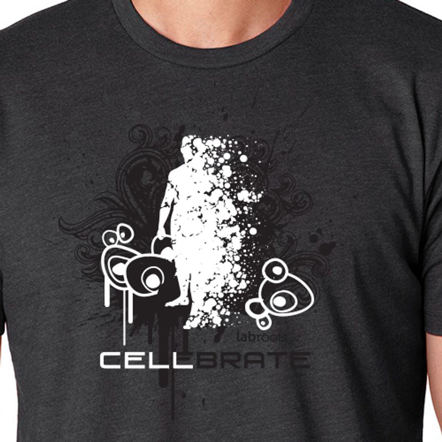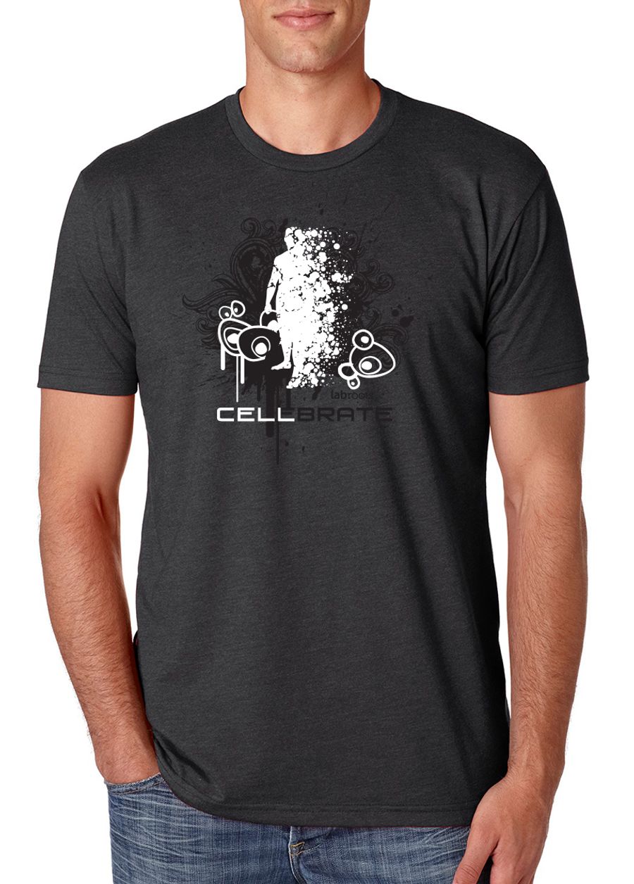 This two-tone design plays with the words cell and celebrates, featuring a silhouette of a human coming from its cellular makeup. The initial design is offset with a backdrop of swirls and splatters, making for a fun, artistic shirt.