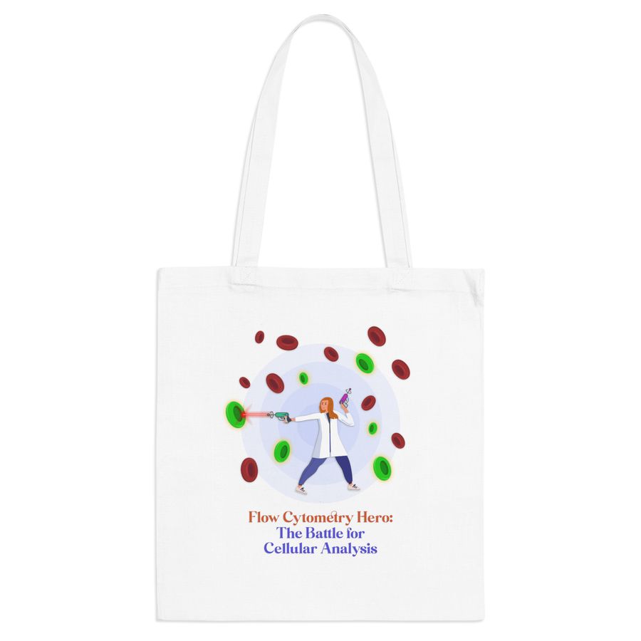 Become the flow cytometry hero your lab needs with this fun reusable tote! This bag is made from 100 percent cotton and is 14.9A6 inches wide and 16.54 inches tall, with 11.81 inch handles. Sustainability and style are in the bag!