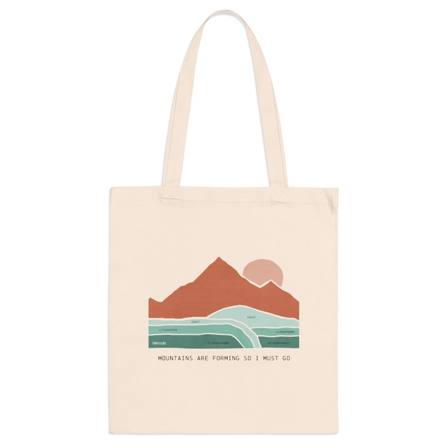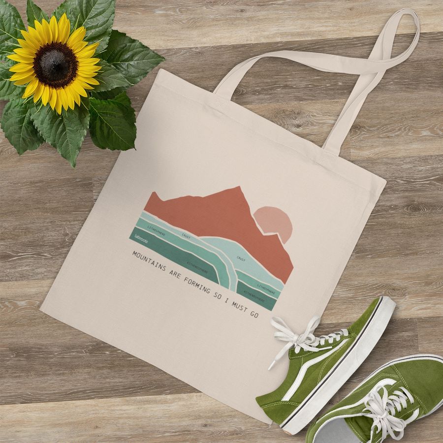 Will you wait while mountains are forming beneath your feet, or pack up and go? If you decide to blaze your own trail, take this bag with you. This bag is made from 100 percent cotton and is 14.96 inches wide and 16.54 inches tall, with 11.81 inch handles. Sustainability and style are in the bag!
