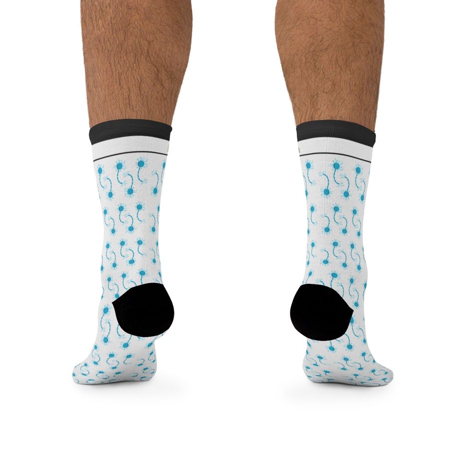 Instead of getting on someone's nerves, wear nerves on you! These white socks showcase a pattern of interweaving blue neurons. The perfect socks for the neurologically obsessed or those who need a clever gift for that one annoying friend that loves getting on your nerves. These socks are made from a blend of 58% Recycled Polyester 22% Nylon 15% Cotton and 5% Elastane. They also fit from a Women's Size 5 (US) up to a Men's Size 12 (US). Sustainability and style pair perfectly in this pair of socks!