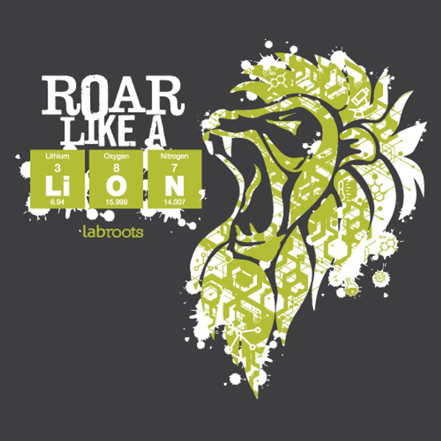 This green and white design features a roaring lion with chemical elements any chemist would love.