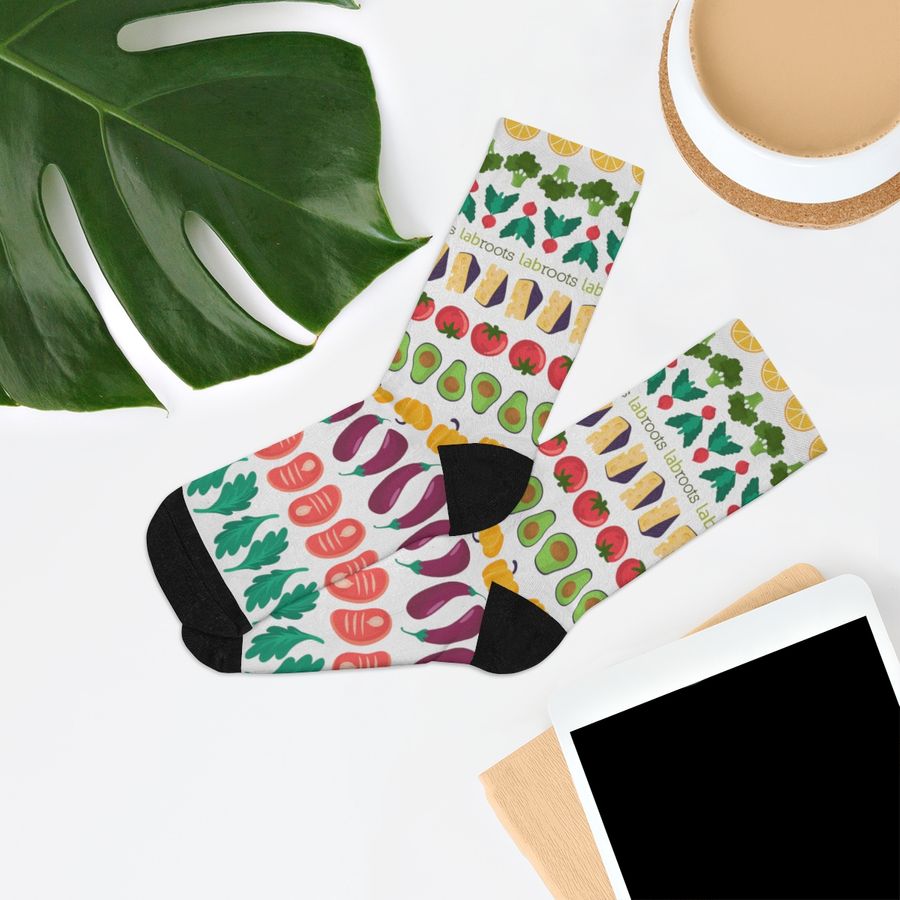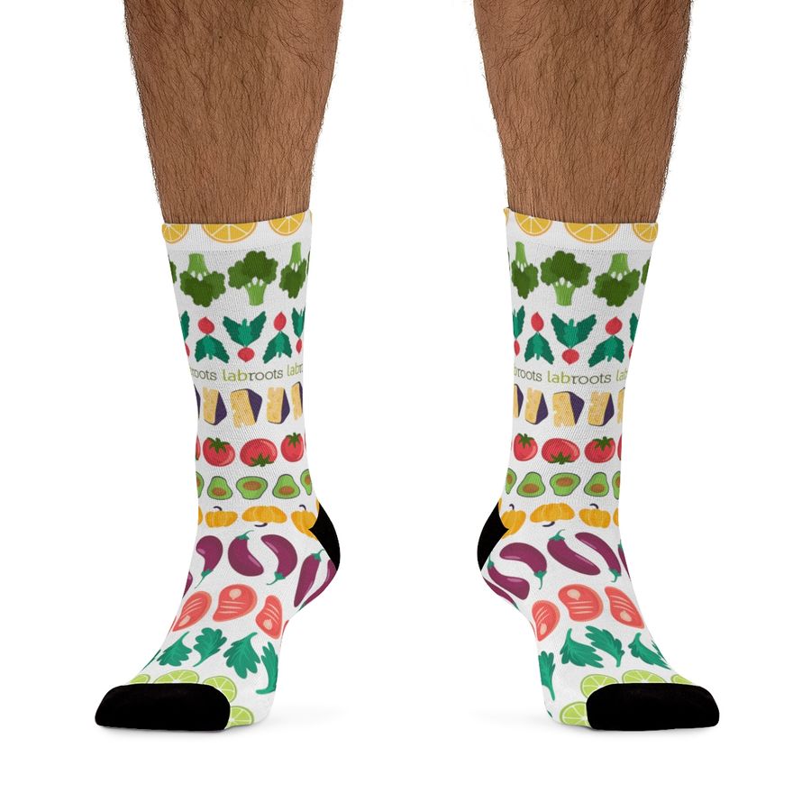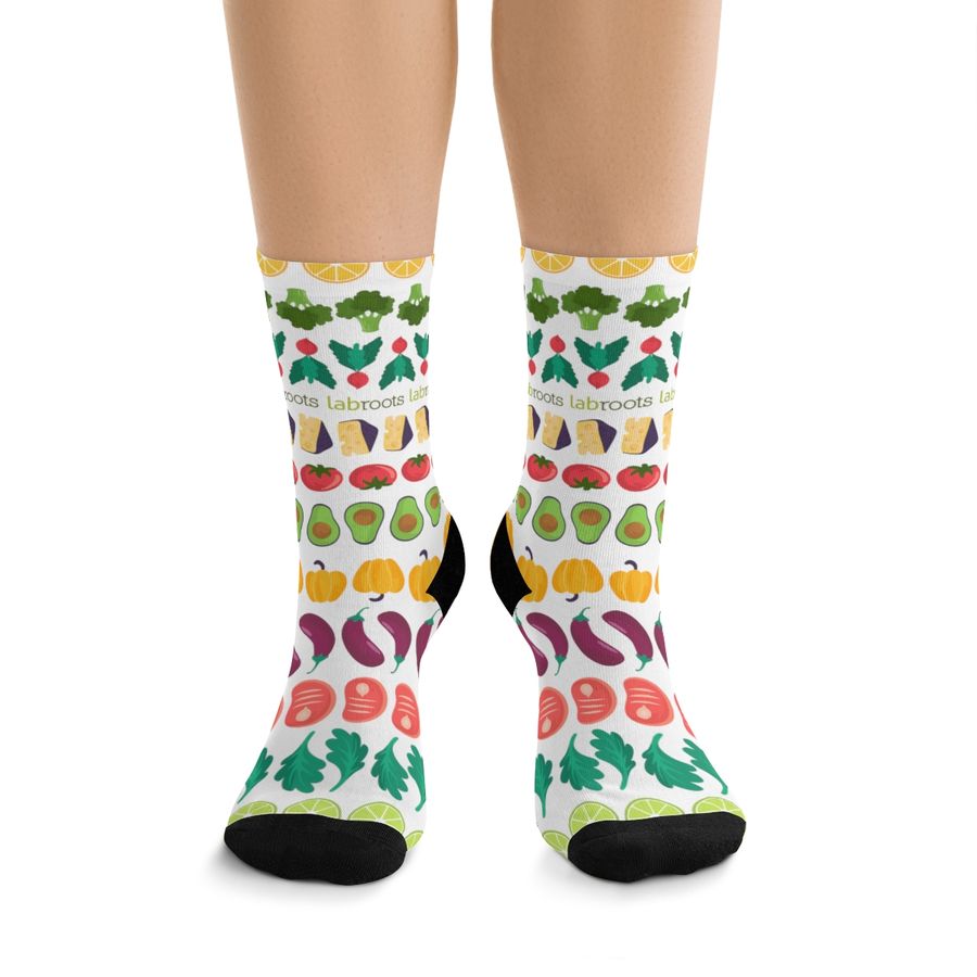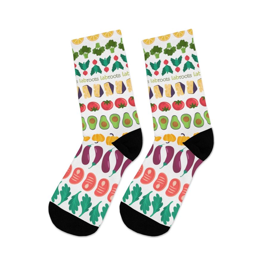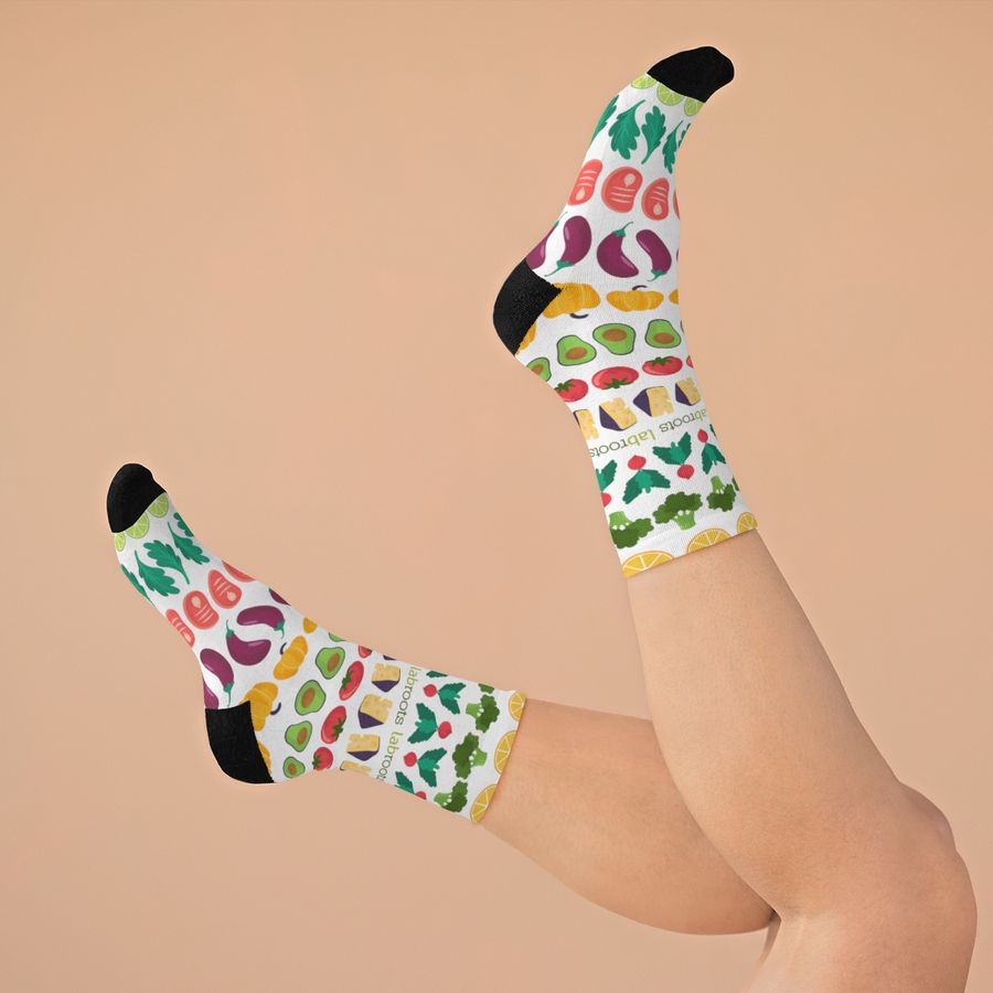 These Unisex, crew-length socks feature a colorful design highlighting the essential food groups.