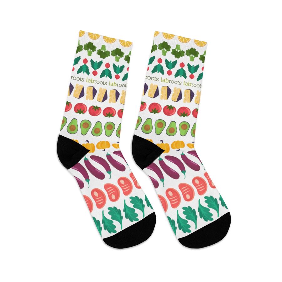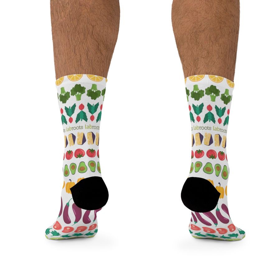 Get your health on! These white socks show off colorful designs of fruits, vegetables, protein foods, and dairy; the building blocks of a healthy diet. The perfect socks to wear when making a healthy meal or a great gift for the health-conscious people in your life! These socks are made from a blend of 58% Recycled Polyester 22% Nylon 15% Cotton and 5% Elastane. They also fit from a Women's Size 5 (US) up to a Men's Size 12 (US). Sustainability and style pair perfectly in this pair of socks!
