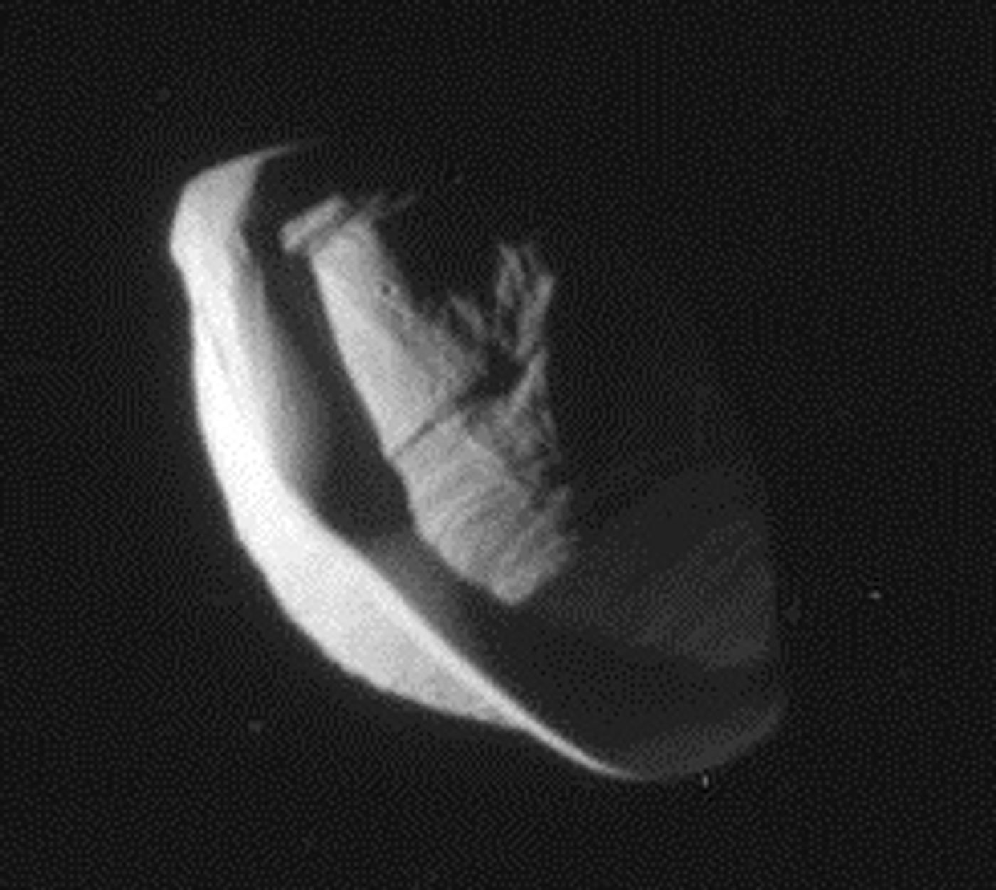 If one were to argue that space is made of food, one such moon of Saturn would make a great case for it, as this ravioli-shaped object orbits the ringed planet while exhibiting a ring of its own, only it’s a lot more solid than Saturn’s massive hula hoops and is often referred to as its equatorial bulge. This is Saturn’s moon, Pan, which was discovered by M.R. Showalter in 1990 after examining Voyager 2 images from 1981.
