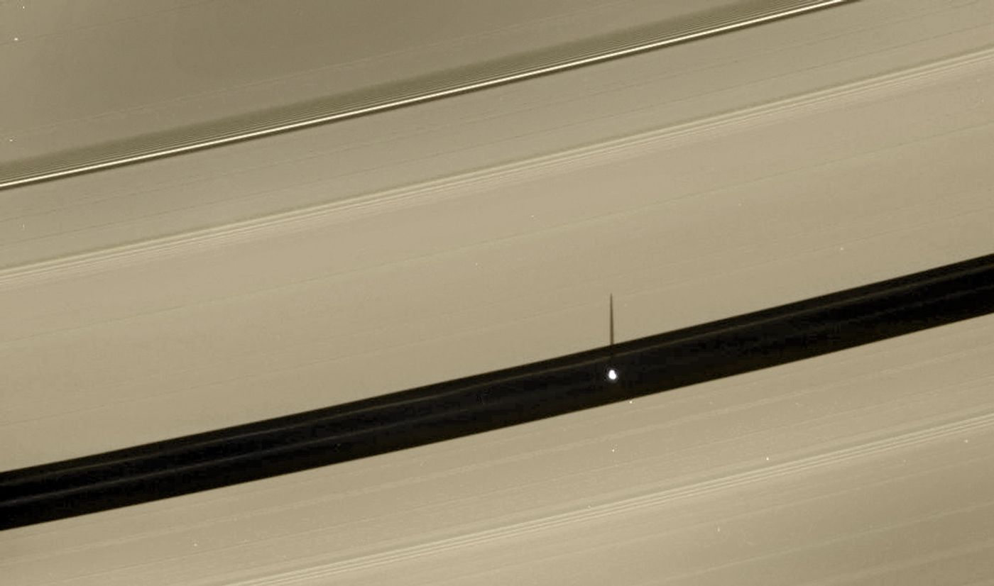 Color-enhanced image of Pan traversing Saturn's Encke Gap taken by NASA's Cassini spacecraft in May 2009. (Credit: NASA/JPL-Caltech/Space Science Institute/Jason Major)