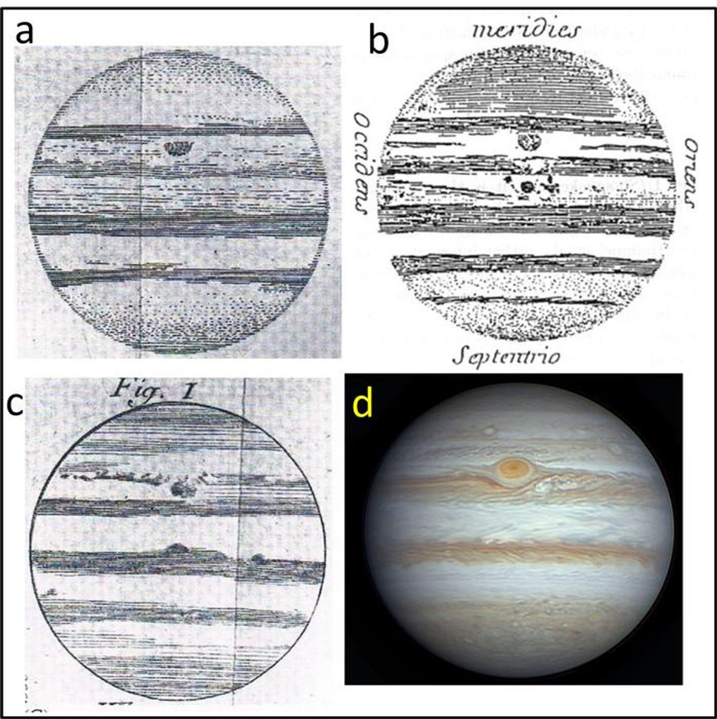Illustrations of Jupiter and its Great Red Spot from the astronomer Giovanni Domenico Cassini in the 17th century (a-c) compared with Jupiter's present-day Great Red Spot as obtained by Eric Sussenbach in 2023. (Credit: Sanchez-Lavega et al. (2024))