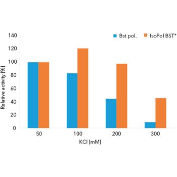 IsoPol™ BST+ is a heat-tolerant Bst polymerase (large fragment) with enhanced strand-displacement activity. IsoPol™ BST+ is active from 25 to 65°C. It is lacking 5’-3’- and 3’-5’-exonuclease activity.