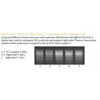 The HighScriber™ Reverse Transcriptase Mix is a premium tool for the high efficiency reverse transcription of up to 12-15 kb long cDNA. Mix includes HighScriber™ Reverse Transcriptase and Ribonuclease Inhibitor for save, robust cDNA synthesis and ease of use. HighScriber™ Reverse Transcriptase allows for high detection sensitivity from 1 pg of total RNA. The wide reaction temperature range (38°C - 55°C) ensures efficient cDNA synthesis from complex or GC rich templates.The enzyme uses ssRNA or ssDNA as a template, possesses no detectable Ribonuclease H activity specific to RNA in RNA-DNA hybrids. A highly reduced Ribonuclease H activity allows for transcription of full lengths long transcripts. HighScriber™ Reverse Transcriptase can be used for RACE as it has terminal transferase activity - adds cytosines to 3’ ends of cDNA.The Ribonuclease inhibitor premixed with the RT ensures RNA protection from ribonuclease degradation.Supplied 5X ALLin™ HighScriber Buffer includes everything you need for the cDNA synthesis reaction. To minimize pipetting steps it contains MgCl2, dNTPs, enhancers, stabilizers. The only things to add is the template RNA and primer./