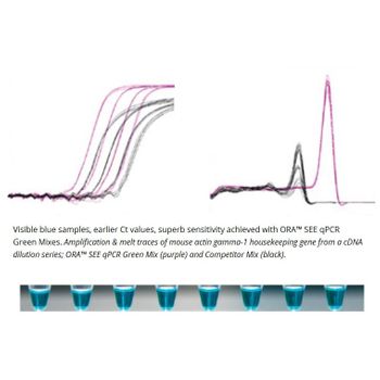 highQu qPCR master mixes are based on the small molecular inhibitor technology Hot Start PCR allowing to achieve highest sensitivity and specificity under both standard and fast qPCR cycling conditions. They provide excellent results on both AT and GC rich templates and guaranty rapid extension with early Ct values with minimum or no optimization.ORA™ SEE qPCR mixes provide an additional advantage of a simplified tracking of the process, as they are colored with an inert blue dye to make samples much better visible during pipetting and handling. Our master mixes are supplied with PCR Water to guaranty the best performance. To suit the broad instrument range the ORA™ qPCR Green Master mixes are available in different versions –with low or high ROX concentration./