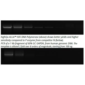 ALLin™ HiFi DNA Polymerase is the outperforming high-fidelity enzyme derived from Pfu polymerase by introducing several point mutations. The robust engineered enzyme in combination with the optimized ALLin™ buffer provides higher fidelity (50X higher than Taq DNA Polymerase), better performance, increased success in demanding applications like amplification of complex or longer templates, crude samples and fast cycling.ALLin™ HiFi DNA Polymerase produces blunt-ended products suitable for ligating into blunt vectors./