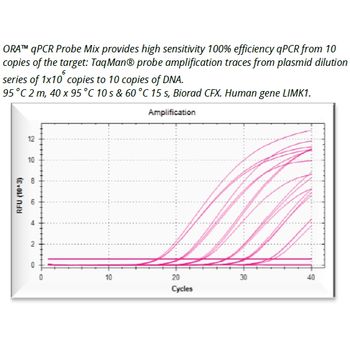 highQu qPCR master mixes are based on the small molecular inhibitor technology Hot Start PCR allowing to achieve highest sensitivity and specificity under both standard and fast qPCR cycling conditions. They provide excellent results on both AT and GC rich templates, in multiplexing and guaranty rapid extension with early Ct values with minimum or no optimization.Our master mixes are supplied with PCR Water to guaranty the best performance. To suit the broad instrument range the ORA™ qPCR Probe Master mixes are available in three versions – without ROX, with low or high ROX concentration./