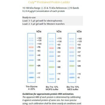 highQu ready to use Prestained Protein Ladders are mixtures of highly recombinant proteins with coupled chromophores providing sharp protein bands and bright colors on denaturing polyacrylamide gels. The high ladder purity allows for exceptional stability and room short term temperature storage. Ladders are ready to be directly loaded on gels without any preparation or heating.  They provide sharp bands for approximate protein sizing and allow for monitoring of electrophoresis process and Western transfer efficiency./